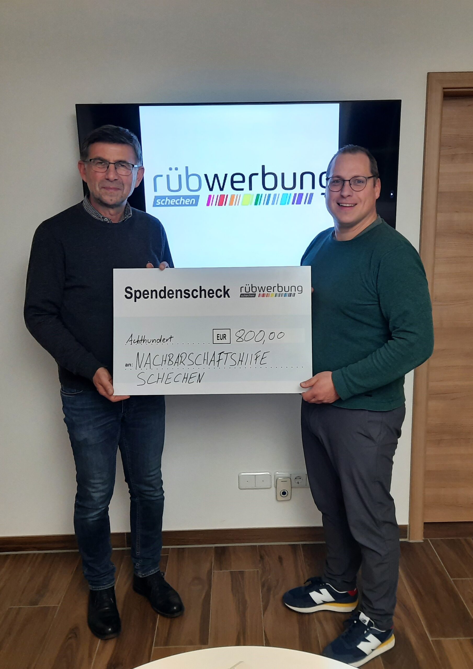 Im Dezember 2025 konnte der Vorsitzende der Nachbarschaftshilfe Schechen, Altbürgermeister Hans Holzmeier (links), von der rübwerbung GmbH & Co. KG wieder einen Spendenscheck in Höhe von 800,00 € entgegennehmen. Geschäftsführer Andreas Rüb ist es ein besonderes Anliegen, die engagierte Arbeit der Nachbarschaftshilfe für die Menschen in der Gemeinde Schechen finanziell zu unterstützen.